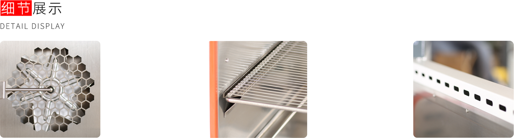內腔:不銹鋼材質,四周圓弧易于清洗,不銹鋼格柵板,隔板高度可調,加熱原件:加熱管分布在背部,330L容積為單組,其余為雙組。