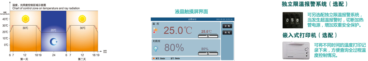 3、微電腦程序控制溫度、光照度,可模擬白天及黑夜的溫度及光照度變化。