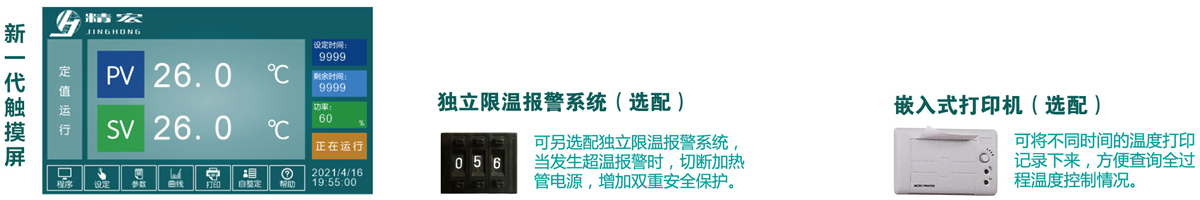 超溫報(bào)警系統(tǒng),超過限定溫度,儀表可進(jìn)行聲光報(bào)警并切斷加熱系統(tǒng)電源,保證實(shí)驗(yàn)安全運(yùn)行不發(fā)生意外。