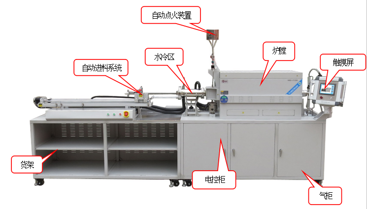 NBD-T系列高溫管式爐,由自動進料系統、高溫加熱系統、冷卻系統、真空系統、自動控制系統、四路進氣系統組成。