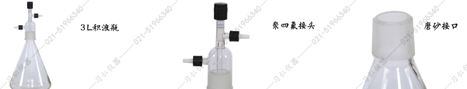 產品采用優質加厚高硼硅玻璃,頂端擰頭為錐形聚四氟材質柱,擰緊即可堵住上端的進液口,擰松即可相同,這種設計防止了吸液逆流想象,產品接收瓶的容量為3L,可以應用于多聯過濾器的中間儲液器,接口為直徑6mm的塔式接頭,材質也為聚四氟