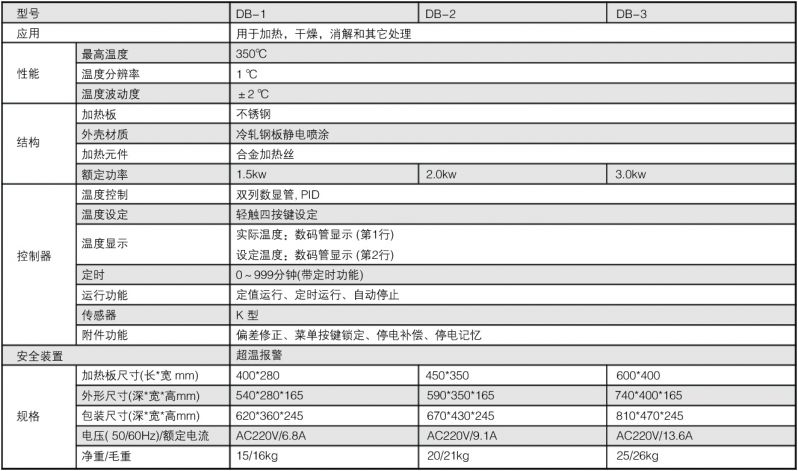 板面采用不銹鋼制成,抗腐蝕、耐老化、使用壽命長,導熱性好,溫度均勻性高,有效加熱面積大,升溫速度快,有利于樣品的加熱。 控溫系統采用微電腦芯片處理器,控溫精度高,功能強。
